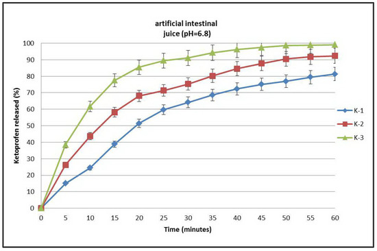 A graph of the dissolution curves of ketoprofen and its complexes with β-cyclodextrin in artificial intestinal juice (pH = 6.8) is presented in Figure 8, where it can be seen that after 60 min ketoprofen (curve K-1) registered a low curve due to its low solubility in the medium. In the case of the ketoprofen–β-cyclodextrin complexes (curves K-2 and K-3), dissolution was slightly improved, which can be observed in the dissolution curves (Figure 8) of both ketoprofen–β-cyclodextrin (2:1) (curve K-2) and ketoprofen–β-cyclodextrin (1:1) (curve K-3).