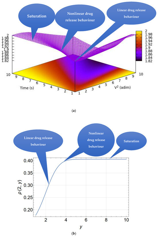 (a) A 3D representation of the drug release rate indicated by the color gradient as a function of time and V2 according to Equation (16), with V2 and time as reduced coordinates. (b) A drug release curve for a particular case (V = 2).