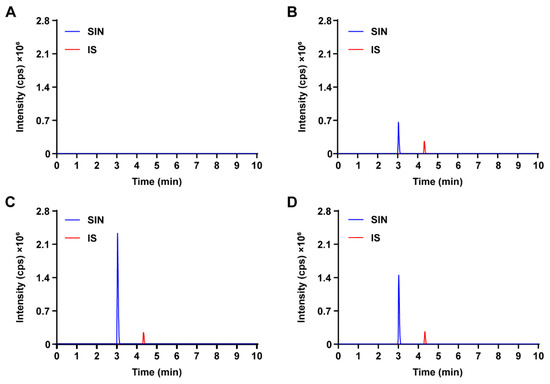 Representative MRM chromatograms of SIN and IS in the intestinal fluid of rats. (A) Blank Krebs–Ringer buffer sample; (B) blank Krebs–Ringer buffer spiked with SIN and IS; (C) intestinal fluid sample were incubated at 37 °C in Krebs–Ringer buffer containing 60 mg/mL SH for 1 h, spiked with IS; (D) intestinal fluid sample were incubated at 37 °C in Krebs–Ringer buffer containing 60 mg/mL SH and 0.25 mg/mL verapamil hydrochloride for 1 h, spiked with IS.