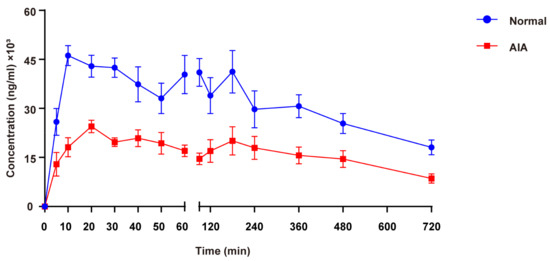 Mean plasma concentration–time curves after oral administration of 600 mg/kg SH in SD female normal and AIA rats. Data are presented as the means ± SEM (n = 6).