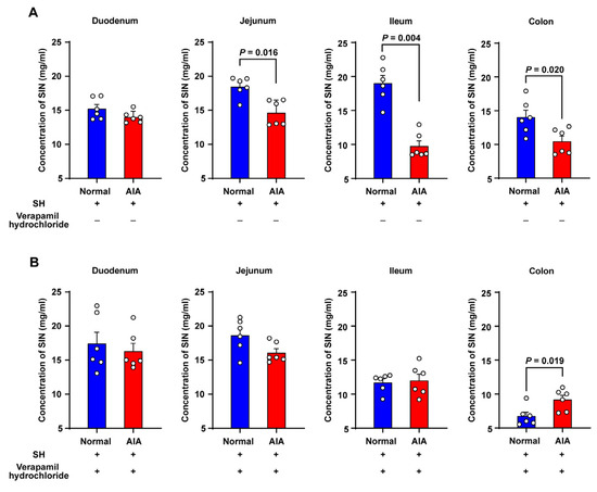 The everted gut sac model was employed to assess the impact of physiological and pathological conditions on SH absorption, quantifying its mucosal transport into the luminal contents of four intestinal segments: duodenum, jejunum, ileum, and colon. Quantitative analysis revealed significantly reduced SH transport in the jejunum, ileum, and colon of AIA rats versus normal controls, whereas duodenal transport remained comparable between groups (Figure 4A). To investigate the mechanistic basis for differential SH uptake, intestinal P–gp activity was examined by co–administering SH (60 mg/mL) with verapamil hydrochloride, a selective P–gp inhibitor. As depicted in Figure 4B, verapamil enhanced SH absorption across the small intestine. Surprisingly, markedly decreased SH absorption was observed in the ileum of normal rats.
