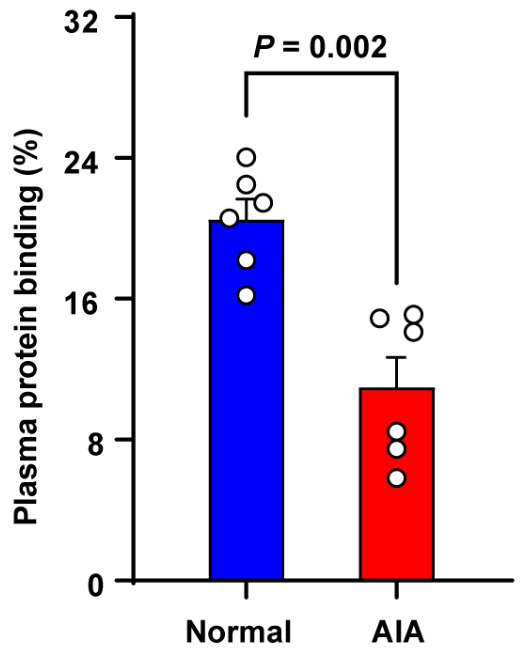 Plasma protein binding of SIN in SD female normal and AIA rats. Data are presented as the means ± SEM (n = 6).
