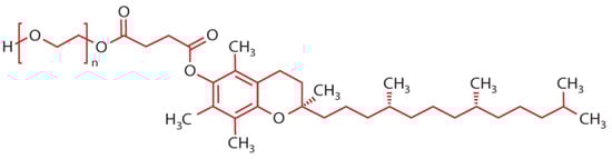TPGS has been approved for use in several specialized products in various countries, which includes the United States and in Europe. Notable examples include Ibuprofen (Boots, Nottingham, UK), Aptivus® (Boehringer Ingelheim, Ingelheim, Germany), Agenerase® (GlaxoSmithKline, London, UK), Viekira Pak™ (Abbvie, Chicago, IL, USA), Technivie™ (Abbvie, Chicago, IL, USA), Zepatier™ (Merck Sharp & Dohme, Rahway, NJ, USA), Fenofibrate (Abbott, Chicago, IL, USA), and Mavyret™ (Abbvie, Chicago, IL, USA), which incorporate TPGS in their formulations as a major inactive ingredient, serving as a solubilizer, surfactant, and therapeutic effect enhancer [,,]. In contrast, Vedrop® (Recordati Rare Diseases Ltd., London, UK) utilizes TPGS as an active ingredient for treating vitamin E deficiency caused by digestive disorders or conditions that impair fat absorption, particularly in children with malabsorption syndromes []. In addition to its role in active compound delivery, various studies have demonstrated that TPGS is a potent free-radical scavenger, which can be beneficial in combating oxidative stress []. This antioxidant feature makes TPGS particularly valuable in pharmaceutical and nutraceutical applications, serving not only as an active compound carrier or excipient but also as an adjunctive molecule that enhances therapeutic outcomes.