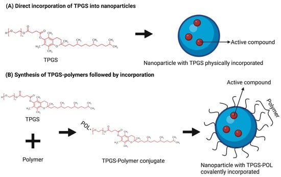 The incorporation of TPGS into nanoparticles can be achieved through two distinct strategies: direct physical incorporation and covalent conjugation followed by incorporation (Figure 3). In the direct approach, TPGS is physically blended with nanoparticle components, allowing its integration into the nanoparticle matrix via non-covalent interactions such as hydrophobic interactions and hydrogen bonding. This method is simple, cost-effective, and preserves the native bioactivity of TPGS; however, it may suffer from limitations such as the potential leaching of TPGS from the nanoparticles and reduced long-term stability []. In contrast, the second strategy involves the chemical synthesis of TPGS-polymer (TPGS-POL) conjugates, where the hydroxyl group at the PEG chain of TPGS is conjugated with a polymer before incorporation into nanoparticles. This covalent conjugation provides enhanced stability by anchoring TPGS within the nanoparticle matrix and allows greater control over nanoparticle properties, including drug release profiles and surface characteristics. Additionally, the conjugation of specific polymers can facilitate targeted delivery as these polymers can serve as ligands for receptors on target cells, enabling selective binding and thereby enhancing the specificity and efficiency of drug delivery []. Despite these advantages, this method is more complex and resource-intensive, and the chemical conjugation may alter some of TPGS’s inherent functionalities. Thus, the choice between these strategies depends on the specific application requirements, balancing simplicity and functionality against stability and customization [].
