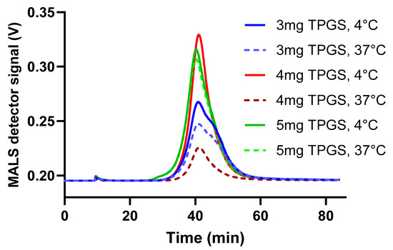 AF4-DLS-MALS fractograms were generated for formulations containing varying concentrations of TPGS. The sample manager was maintained at either 4 °C to simulate the fridge storage conditions or at 37 °C to mimic body temperature. The data are represented as mean ± SD (N = 1).