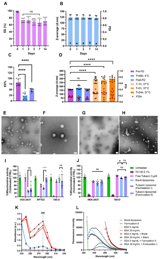 Formulations I and II characterization. (A) Encapsulation efficiency stability at 4 °C for 14 days for Formulation I. (B) Z-average and PDI stability of Formulation I at 4 °C obtained with DLS in batch mode. (C) Encapsulation efficiency of Formulation II pre-freeze-drying (FD), during storage for 48 h at 4 °C, and post-FD. (D) Z-average and PDI stability of Formulation II pre-FD, after 48 h of storage at 4 °C, post-FD, and in PBS at 37 °C for 1, 2, and 24 h. (E,F) TEM images of Formulation I. Scale bars = 500 nm (E) and 200 nm (F). (G,H) TEM micrographs of Formulation II pre-FD (G) and post-FD (H). Scale bars = 500 nm (G) and 200 nm (H). Mitochondrial activity of Formulation I (I) and Formulation II (J) on different renal cell lines after 24 h of treatment. An albumin interaction study with Formulation II after one hour of incubation. (K) The absorbance spectrum of Formulation II and (L) fluorescence spectrum after excitation at 280 nm Data were normalized to untreated cell results. Data are represented as mean ± SD (N = 3). **** indicates p < 0.0001, * p < 0.005, and ns stands for non-significance.