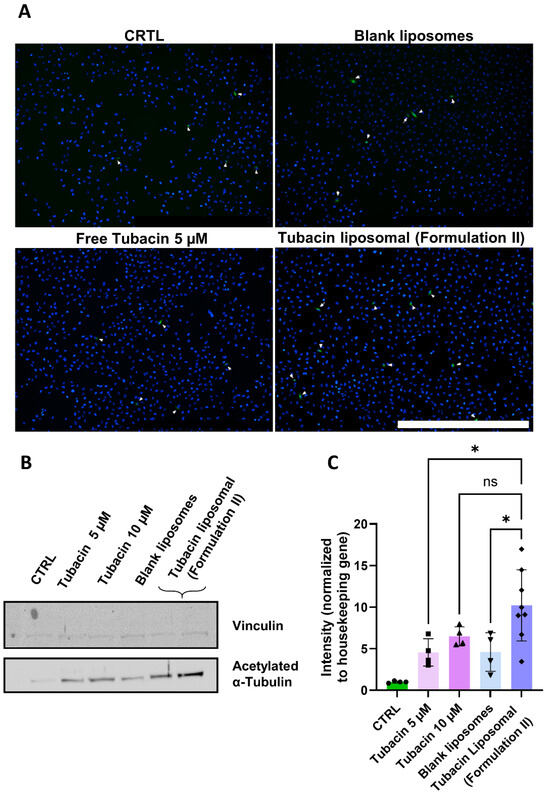 Western blot analysis further supported these findings, revealing that the treatment with liposomal tubacin resulted in a staining intensity comparable to that of free tubacin at 10 µM (Figure 3B,C). Notably, liposomal tubacin at 5 µM exhibited superior efficacy compared to free tubacin at the same concentration.