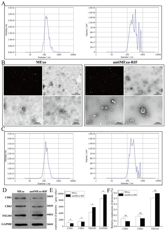 Characterization of macrophage-derived exosomes before and after engineering modification and drug loading. (A) Nanoparticle tracking analysis (NTA) of macrophage exosomes (MExo). (B) Transmission electron microscopy (TEM) images of macrophage exosomes (MExo) and the engineered exosome drug delivery system (antiMExo-RIF). (C) Nanoparticle tracking analysis (NTA) of the engineered exosome drug delivery system (antiMExo-RIF). (D–F) Western blot results before and after exosome modification. The expression levels (gray value) and relative expression levels of surface characteristic proteins of macrophage exosomes (MExo) and the engineered exosome drug delivery system (antiMExo-RIF). (ns, not significant).