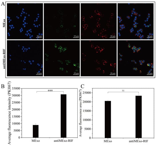 Confocal microscopy images and quantitative fluorescence analysis of macrophages co-incubated with the engineered exosome drug delivery system (antiMExo-RIF). (A) Confocal microscopy images showing fluorescence labeling in macrophages after co-incubation with MExo or antiMExo-RIF. Nuclei were stained with DAPI (blue), cytoskeleton with red fluorescence, and exosomes labeled with PKH67 (green). (B) Quantitative analysis of PKH67 average fluorescence intensity. (C) Quantitative analysis of PKH67 mean fluorescence area. (NS, not significant. ***, p < 0.001).