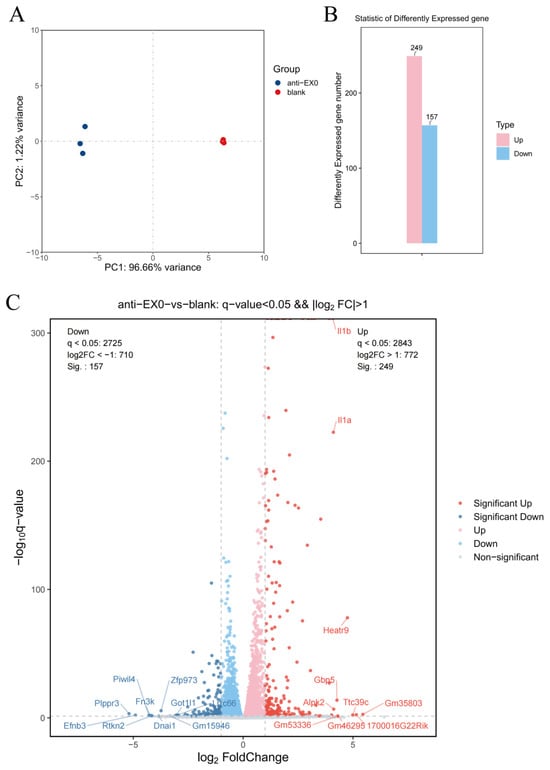 Transcriptomics of macrophages after intervention with the exosome drug delivery system (antiMExo-RIF). (A) Principal component analysis (PCA). (B) Comparison of the expression levels of up-regulated and down-regulated differential genes. (C) Volcano plot of differential gene expression. The up-regulated genes are distributed in the upper right region of the plot, and the down-regulated genes are in the lower left region. Each dot represents a gene, the size of the dot indicates the level of gene expression, and the color represents the significance level of differential gene expression.