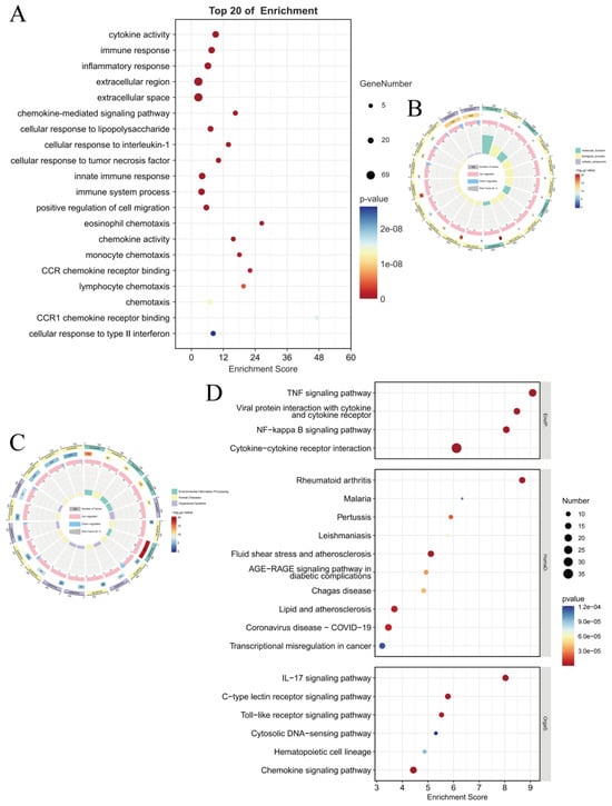 Through Gene Ontology (GO) enrichment analysis, it was found that these differentially expressed genes were significantly enriched in three aspects: biological processes, cellular components, and molecular functions (Figure 4A,B). In terms of biological processes, they were mainly enriched in “inflammatory response”, “cytokine activity”, “immune response”, “innate immune response”, and “immune system process”. In terms of cellular components, the differentially expressed genes were enriched in “extracellular region” and “extracellular space”. In terms of molecular functions, they were mainly enriched in functions such as “eosinophil chemotaxis”, “chemokine activity”, “monocyte chemotaxis”, and “CCR chemokine receptor binding”. These functions are closely related to macrophage recognition, the uptake of exosomes, and subsequent signal transduction and functional regulation.