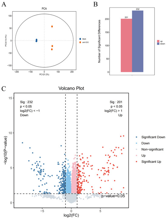 Proteomics of macrophages after intervention with the exosome drug delivery system (antiMExo-RIF). (A) Principal component analysis (PCA). (B) Comparison of the expression levels of up-regulated and down-regulated differential genes. (C) Volcano plot of differential gene expression.