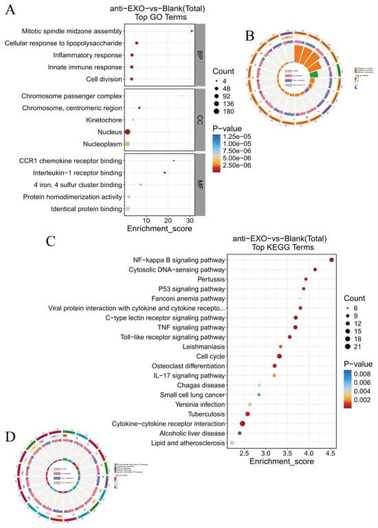 (A) Bubble plot and (B) circle diagram of the top 20 Gene Ontology (GO) enrichments in the transcriptomics of macrophages after intervention with the exosome drug delivery system (antiMExo-RIF). (D) Bubble plot and (C) circle diagram of the top 20 Kyoto Encyclopedia of Genes and Genomes (KEGG) pathway enrichments.