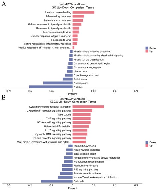 (A) Comparison of protein functions in GO enrichment and (B) comparison of pathways in KEGG enrichment for up-regulation and down-regulation in the proteomics of macrophages after intervention with the exosome drug delivery system (antiMExo-RIF).