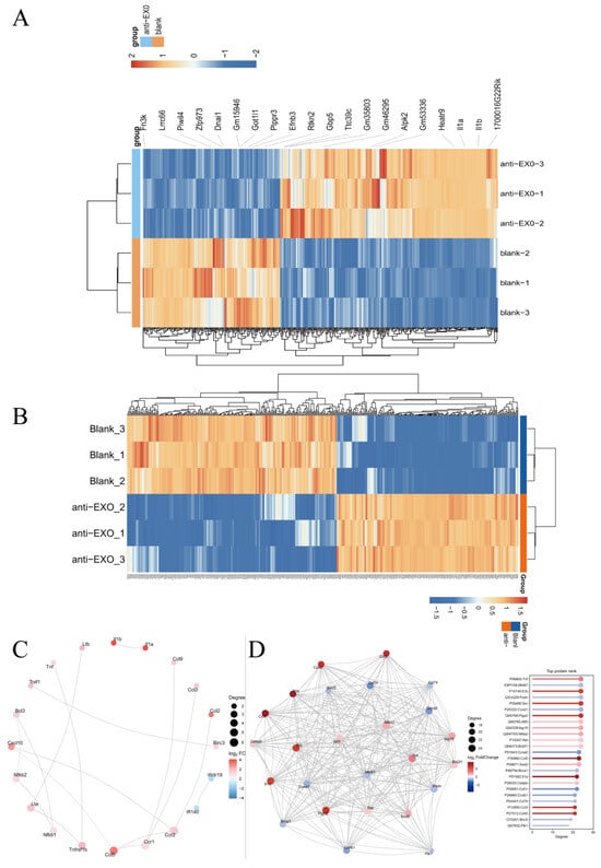 (A) Heat map of differential gene expression in transcriptomics, (B) heat map of differentially expressed proteins in proteomics, (C) network co-occurrence diagram of differential genes, and (D) network co-occurrence diagram of differential proteins of macrophages after intervention with the exosome drug delivery system (antiMExo-RIF).