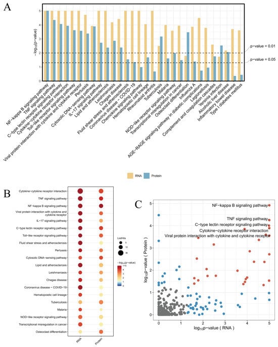 The combined analysis of transcriptomics and proteomics can comprehensively reveal the panorama of gene expression. By leveraging the complementary nature of transcriptomics and proteomics, more complete gene expression information can be obtained, enhancing the accuracy and reliability of the research. The mutual validation of multi-omics data helps reduce false-positive results. The study found that the enriched pathways showed consistency between transcriptomics and proteomics, particularly in the NF-κB signaling pathway, TNF signaling pathway, and Cytokine–cytokine receptor interaction, which were the most significant pathways (Figure 9A). This indicates that these pathways are regulated by antiMExo-RIF at both the gene and protein expression levels. The bubble chart (Figure 9B) shows that these pathways exhibit higher significance at the RNA level and involve a larger number of genes, while at the protein level, the significance is lower and fewer proteins are involved. This discrepancy may reflect the complex relationship between transcriptional regulation and translational regulation, as well as potential additional regulatory mechanisms at the protein level. However, the ranking of the number of genes and proteins involved in these pathways remains consistent. From the volcano plot (Figure 9C), it can be observed that most signaling pathways show some correlation in significance between the RNA and protein levels, but some pathways deviate significantly from the diagonal. For example, the NF-κB signaling pathway, TNF signaling pathway, and Cytokine–cytokine receptor interaction exhibit high significance at both RNA and protein levels, and are located in the upper right quadrant of the scatter plot, indicating that they are tightly regulated at both levels.