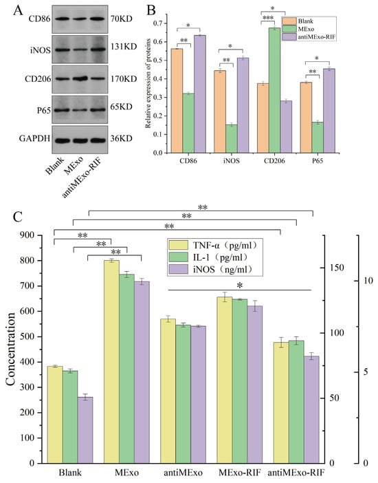 (A,B) Western blotting (WB) detection of polarization markers and P65 protein in the NF-κB signaling pathway, (C) quantitative detection (ELISA) of inflammatory factors TNF-α, IL-6, and iNOS of macrophages after intervention with the exosome drug delivery system (antiMExo-RIF). (*, p < 0.05. **, p < 0.01. ***, p < 0.001).