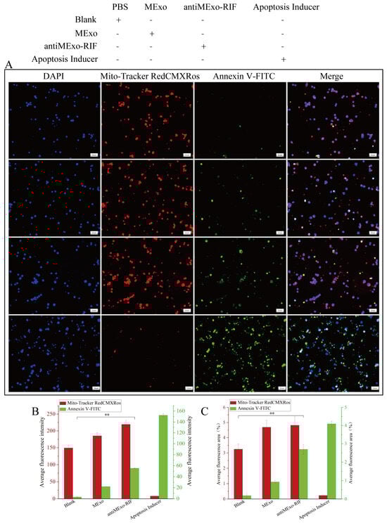 (A) Detection of cell apoptosis using the Mitochondria Membrane Potential and Apoptosis Detection Kit with Mito-Tracker Red CMXRos and Annexin V-FITC after macrophages had been supplemented with the exosome drug delivery system (antiMExo-RIF). (B,C) Quantification of the average fluorescence intensity and fluorescence area. Scale bar: 50 µm. (**, p < 0.01).