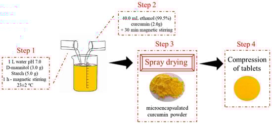 The wall materials, D-mannitol ≥ 98% (3.0 g) (Sigma-Aldrich, St. Louis, MO, USA), curcumin 100% (PDT Pharma-LTDA, Cravinhos, SP, Brazil) and soluble starch ≤98% (5.0 g) Exôdo Científica (Sumaré, SP, Brazil) were used. The protocols for obtaining microencapsulated curcumin were based on the literature with modifications [28]. Figure 1 to explain the formulation methods. The biopolymers were dissolved in 1 L of water adjusted to pH 7.0 and kept under constant magnetic stirring at 23 ± 2 °C for 1 h (Step 1). Simultaneously, 2.0 g of curcumin powder, purchased from a commercial supplier, was dissolved in 40.0 mL of 99.5% ethanol, stirred for 1 h, and protected from light. The prepared solutions were then combined and stirred for an additional 30 min, also protected from light, to ensure complete homogenization (Step 2).