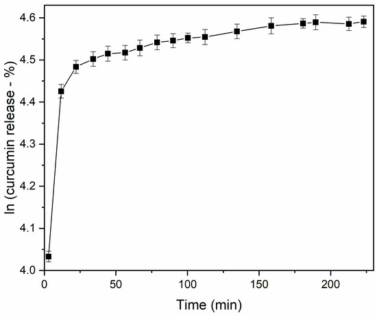 Release profile of curcumin from spray-dried process. The Y-axis represents the natural logarithm (ln) of the concentration (%) of curcumin released over time.