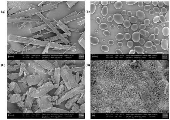 Figure 4 shows the surface morphology of the active curcumin, excipients starch and D-mannitol, and the microencapsulated curcumin. Each material exhibited distinct morphological characteristics. The free curcumin (Figure 4A) exhibits the form of well-faceted crystals. Starch (Figure 4B) has a spherical and regular morphology, with a smooth surface. D-mannitol, (Figure 4C), is characterized by an irregularly shaped rod structure. Finally, Figure 4D of microencapsulated curcumin shows that the spherical morphology is not homogeneous with surface deformations of the microcapsules being smooth and rough. It is noted that the curcumin microcapsules indicated by arrows in the image may be hollow inside. Similar morphologies for curcumin microencapsulated by spray-drying method have been reported in different biopolymers [28,35,37].