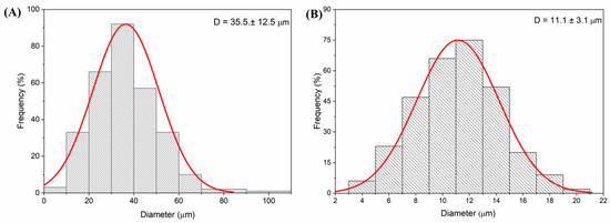 Microparticle size distribution: (A) starch—average size of 35 ± 12.5 µm and (B) microencapsulated curcumin—average size of 11.1 ± 3.1 µm.