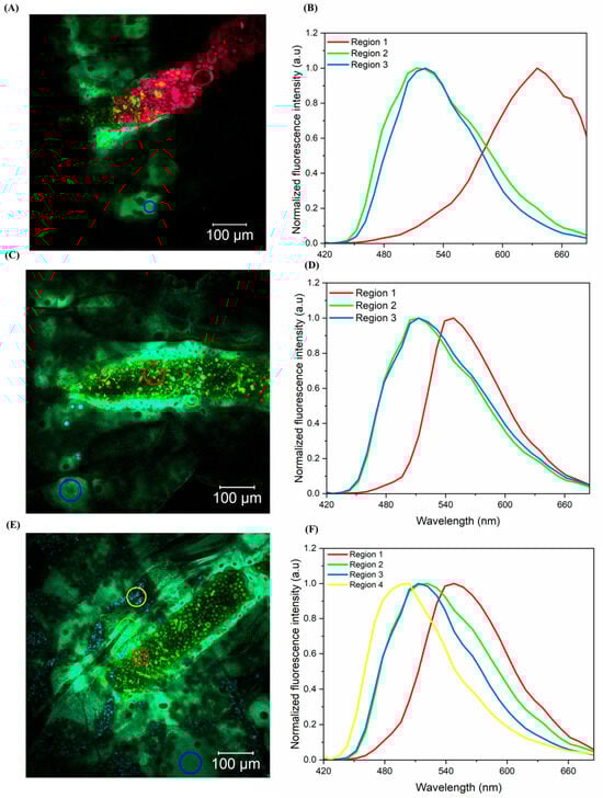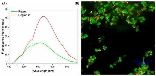 Figure 6 shows confocal fluorescence microscopy images of microencapsulated curcumin, obtained by the spray-drying process. Figure 6A shows the fluorescence spectra of microencapsulated curcumin with characteristic emission bands between the 540–650 nm regions, obtained through confocal microscopy [41,42].