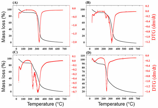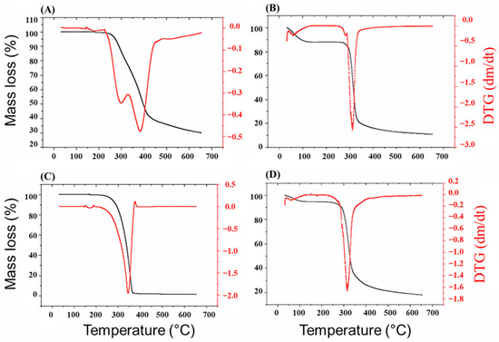 Starch (Figure 7B) showed two decomposition events, one of which was related to water loss, between 52 and 126 °C (approximately 8.6%) and the second related to polymer composition between 264 and 347 °C (approximately 67.1%). This event is indicated by the DTG curve by the average peaks at 61 °C and 312 °C. According to the botanical origin of starch and the proportions of amylose and amylopectin, its thermal decomposition can vary between 160 °C and 380 °C [45].