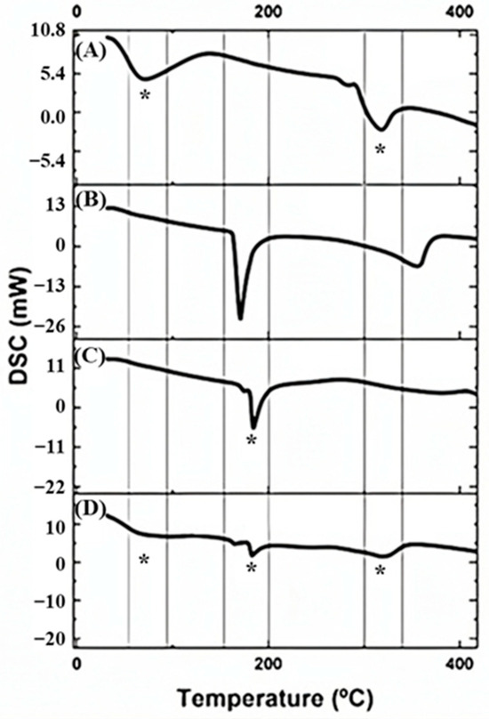 DSC curves: (A) starch; (B) D-mannitol; (C) free curcumin; (D) curcumin microcapsule. (*) indicates the common thermal events that occurred for the samples, indicating the compatibility of the components.
