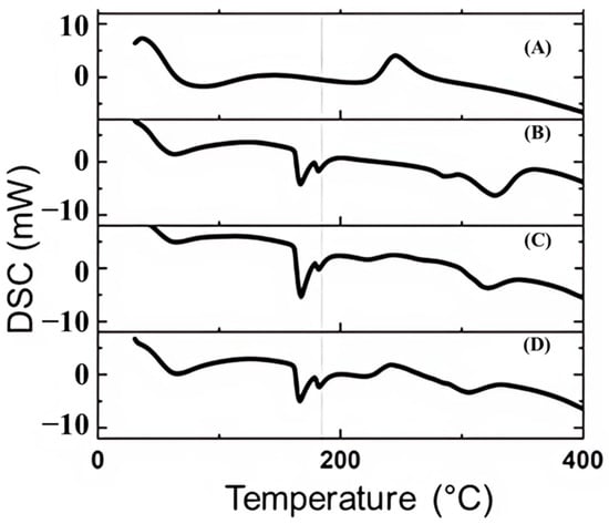 Figure 9A–D presents the results obtained by differential scanning calorimetry (DSC) analyses of free curcumin, soluble starch, D-mannitol, and microencapsulated curcumin. The thermogram for soluble starch is presented in Figure 9A, with an endothermic peak in the region of 74 °C, corresponding to the starch gelatinization process [50], and another endothermic peak at 321 °C corresponding to the decomposition of starch [51]. The DSC curve for the biopolymer D-mannitol (Figure 9B) shows a characteristic sharp endothermic peak at 170 °C, indicating the melting behavior of the polymer [52].