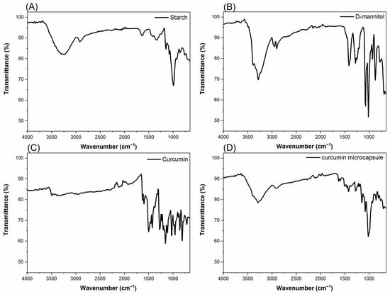 FTIR spectra of the encapsulant, active and microcapsule materials: (A) starch, (B) D-mannitol, (C) curcumin and (D) microencapsulated curcumin.