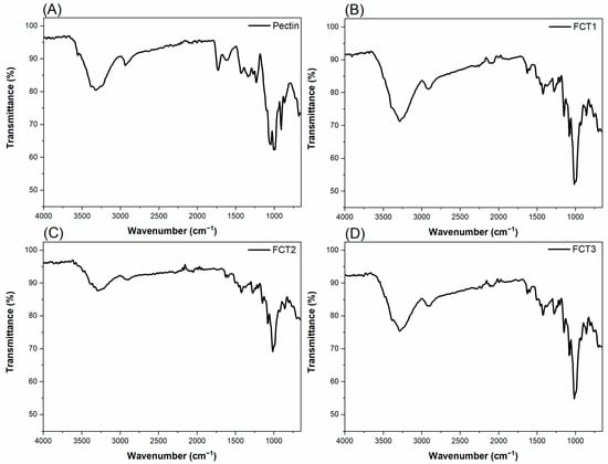 The DSC analyses for the microencapsulated curcumin formulations FCT1, FCT2, and FCT3 are presented in the thermograms of Figure 10. Figure 10A shows the DSC thermogram curve of the degradation of citrus pectin with an endothermic peak between the heating regions of 50 and 150 °C, characteristic of this type of polysaccharide [54,55]. A second exothermic event indicates the degradation of citrus pectin between the heating regions of 220 and 275 °C [56,57].