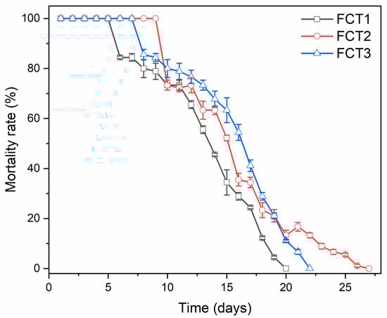 The residual activity of the tablet formulations FCT1, FCT2, and FCT3 was evaluated in the laboratory according to the methodology described in Vani et al. 2018, with modifications [33]. The tablets were added to plastic containers containing 1 L of distilled water, to which groups of 25–30 third instar (L3) Ae. aegypti larvae were introduced. Tablets without curcumin microcapsules were used as negative controls. Larval mortality was checked daily, and all larvae (dead or alive) were removed from the container and replaced with new larvae. This replacement continued until the tablets completely lost efficacy over 30 days. The experiments were conducted in triplicate under irradiation from a system of 18 W white, fluorescent lamps, with an irradiance of 0.83 mW/cm2 and a photoperiod of 12 h/12 h.