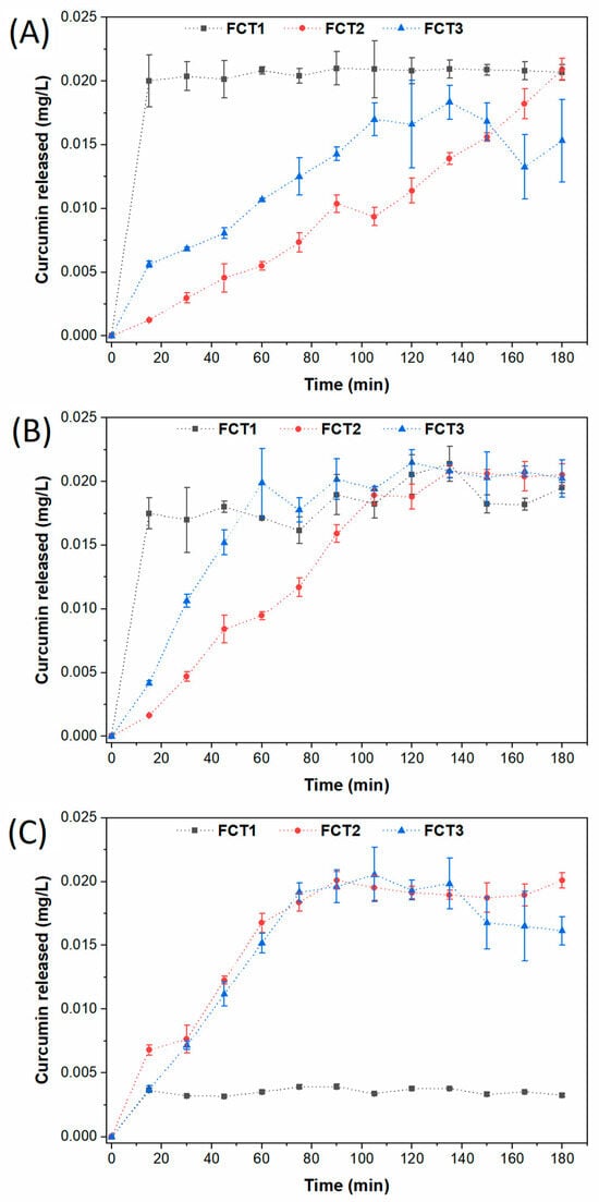 The onset of total degradation for FCT2 and FCT3 formulations in the DSC thermogram occurs between temperatures of 306 and 321 °C, respectively. The results of the DSC analyses indicate that it was possible to incorporate curcumin into the components of the formulations, showing affinity between them. These results showed that curcumin is compatible with the components of the formulations, since its characteristics were maintained. The presence and change of thermal events associated with curcumin may also reflect the stabilization of its enol or diketo forms, especially in the encapsulated state, since these tautomers exhibit distinct thermal and spectroscopic signatures [60].