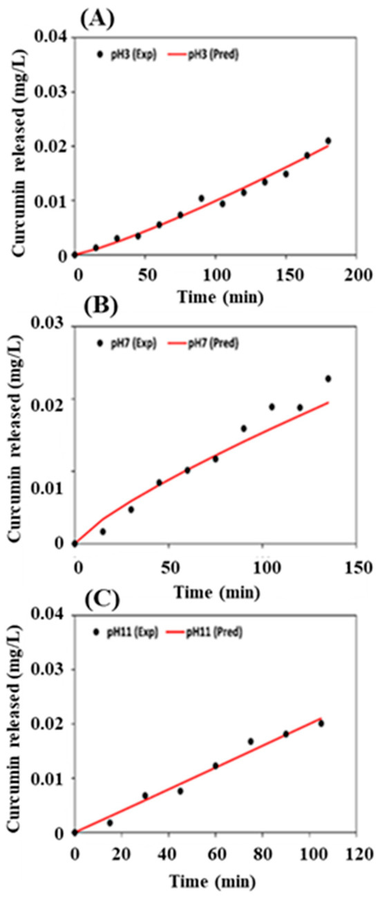 Formulation FCT2 showed that the release of the active ingredient was slower depending on the pH. The release of FCT2 was explored in a mathematical model that shows how the release of the active ingredient behaves depending on the pH, which is relevant for understanding the dispersion of curcumin in the microbiota in Ae. aegypti breeding sites, since there is a variation in pH in the environment. After the release test, the values obtained from the analyzes were plotted and adjusted to the Korsmeyer–Peppas model according to Equation (2).