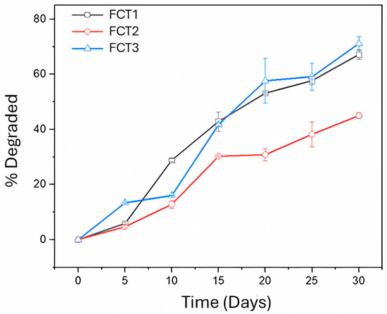 In Figure 8C, for the FCT3 formulation, the addition of 17.5% pectin and 42.5% starch in its composition presented a thermogravimetric curve similar to FCT1 and FCT2. The loss was that the first thermal event of water loss occurred between the regions of 32–112 °C (8%), and the second event of mass loss (%) in the region of 179 and 241 °C (approximately 10.7%) and the third event referring to the complete loss of mass of the sample between 241 and 402 °C (approximately 48.7%). This higher heating rate may indicate a greater number of compounds that lose mass slowly, such as water, or a change in thermal instability due to the new proportions of the formulation components. For FCT3, two thermal events were obtained with an average between 231 and 305 °C in the DTG curve, respectively.