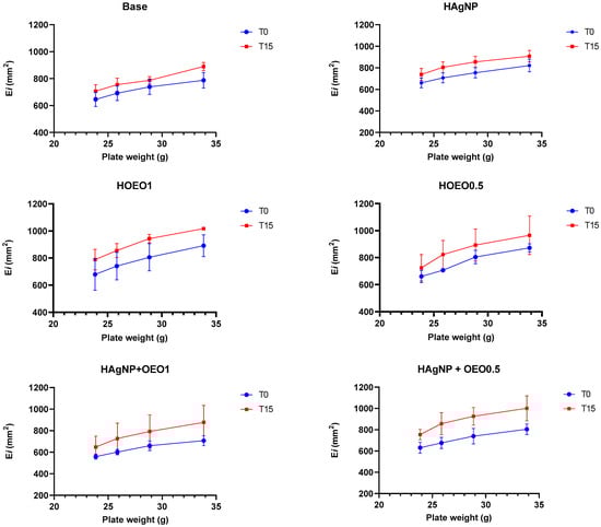 After the pre-stability test, all hydrogels remained stable, without any visible change in color, odor, or aspect, and with no signs of phase separation. Regarding the organoleptic characteristics, base, HO1, and HO0.5 formulations presented a white color and were homogeneous, while for odor, the base was odorless, and HO1 and HO0.5 presented a smell characteristic of the OEO. Moreover, HAgNP, HAgNP + OEO1, and HAgNP + OEO0.5 formulations presented a light brown color (caramel) and were homogeneous, while for odor, HAgNP was odorless, and HAgNP + OEO1 and HAgNP + OEO0.5 presented a smell characteristic of the OEO. Related to the physical–chemical characteristics, all formulations presented a pH of around 6.9 and a density closer to 10.0. The spreadability of hydrogels (Figure 1) increased proportionally to the weights applied under the formulations, which was already expected.