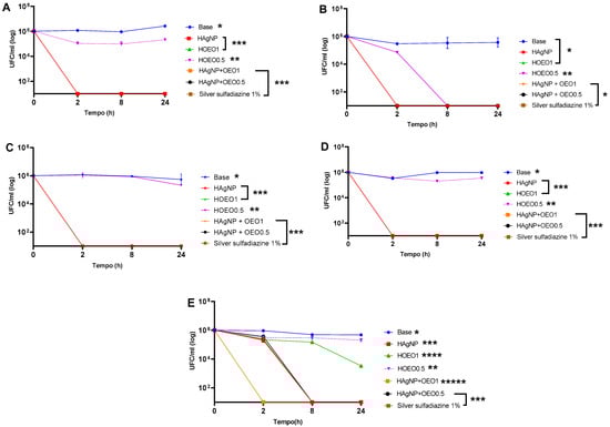 Time–kill curve of clinical isolates: (A) P. aeruginosa 1461; (B) P. aeruginosa 1634; (C) P. aeruginosa 117; (D) K. pneumoniae 11091; (E) S. aureus 999. Each isolate presented the p-value at different times: (A) * Base: 0–24 h; 2–8 h; 2–24 h; 8–24 h: p < 0.0001; ** HOEO0.5: 0–2 h; 0–8 h; 0–24 h; 2 -24 h; 8–24 h: p < 0.0001; *** HAgNP; HOEO1; HAgNP + OEO0.5; HAgNP + OEO1; silver sulfadiazine 1%: 0–2 h; 0–8 h; 0–24 h: p < 0.0001; (B) * Base; HAgNP; HOEO1; HAgNP + OEO0.5; HAgNP + OEO1; silver sulfadiazine 1%: 0–2 h; 0–8 h; 0–24 h: p < 0.0001; ** HOEO0.5: 0–2 h; 0–8 h; 0–24 h; 2–8 h; 2–24 h: p < 0.0001; (C) * Base: 0–24 h; 2–8 h; 2–24 h; 8–24 h: p < 0.0001; ** HOEO0.5: 0–24 h; 2–24 h; 8–24 h: p < 0.0001; *** HAgNP; HOEO1; HAgNP + OEO0.5; HAgNP + OEO1; silver sulfadiazine 1%: 0–2 h; 0–8 h; 0–24 h: p < 0.0001; (D) * Base: 0–2 h; 0–8 h; 0–24 h; 2–8 h; 2–24 h: p < 0.0001; ** HOEO0.5: 0–2 h; 0–8 h; 0–24 h; 2–8 h; 8–24 h: p < 0.0001; *** HAgNP; HOEO1; HAgNP + OEO0.5; HAgNP + OEO1; silver sulfadiazine 1%: 0–2 h; 0–8 h; 0–24 h: p < 0.0001; (E) * Base: 0–8 h; 0–24 h; 2–8 h; 2–24 h: p < 0.0001; ** HOEO0.5: 0–2 h; 0–8 h; 0–24 h; 2–24 h; 8–24 h: p < 0.0001; *** HAgNP; HAgNP + OEO0.5; silver sulfadiazine 1%: 0–2 h; 0–8 h; 0–24 h; 2–8 h; 2–24 h: p < 0.0001; **** HOEO1: 0–2 h; 0–8 h; 0–24 h; 2–8 h; 2–24 h; 8–24 h: p < 0.0001; ***** HAgNP + OEO1: 0–2 h; 0–8 h; 0–24 h: p < 0.0001.