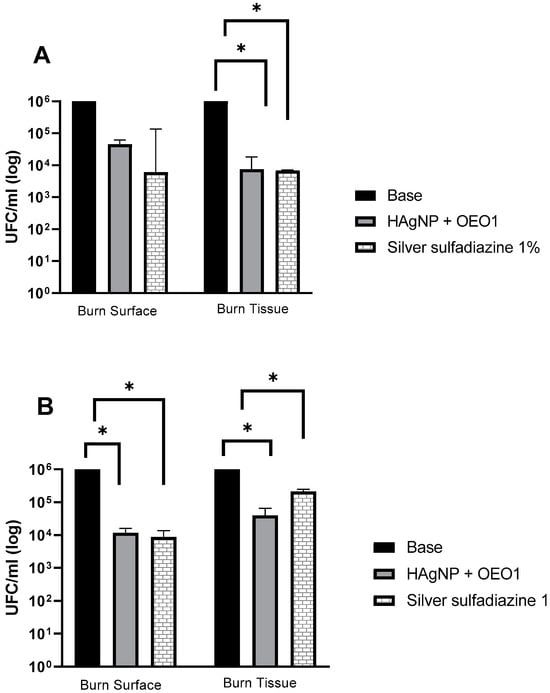 Evaluation of antimicrobial treatments in the ex vivo model. (A) P. aeruginosa 1461 and (B) S. aureus 999. Treatments that presented a value of p ≤ 0.005 are indicated by the symbol (*). Base: hydrogel without the actives; HAgNP + OEO1: hydrogel containing bio-AgNP 500 µM + OEO 1%.