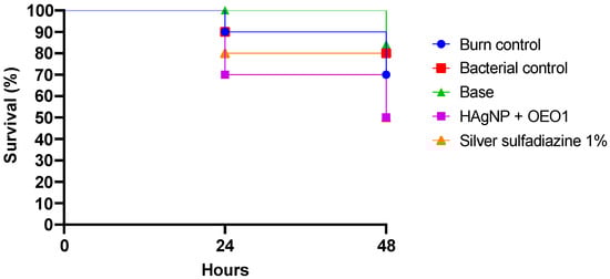 The time–kill assay was performed according to the National Committee on Clinical Laboratory Standards (NCCLS) [49], with modifications. Microorganisms of each bacterial species were selected considering their resistance profile. The microorganisms stored in BHI glycerol were cultured in tryptone soy broth (TSB—Difco®) for 24 h and subsequently plated on tryptone soy agar (TSA—Difco®) for 24 h. The bacterial inoculum was prepared in PBS and adjusted to the 0.5 MacFarland scale, which corresponds to approximately 1.5 × 108 CFU/mL. Then, 1 g of each formulation (base; HAgNP; HOEO1; HOEO0.5; HAgNP + OEO1; HAgNP + OEO0.5 and silver sulfadiazine 1%) was added to conical tubes with 9 mL of PBS (dilution 1:10). Then, 100 µL of the bacterial inoculum was added and serial dilution of the initial time (T0) was performed. For this, 100 µL of this sample was added to 900 µL of PBS, and 10 µL (in triplicate) was placed in TSA. The plates were incubated for 24 h at 37 °C. The formulations were incubated at 37 °C, and serial dilution was performed at the determined times (2 h, 8 h, and 24 h).