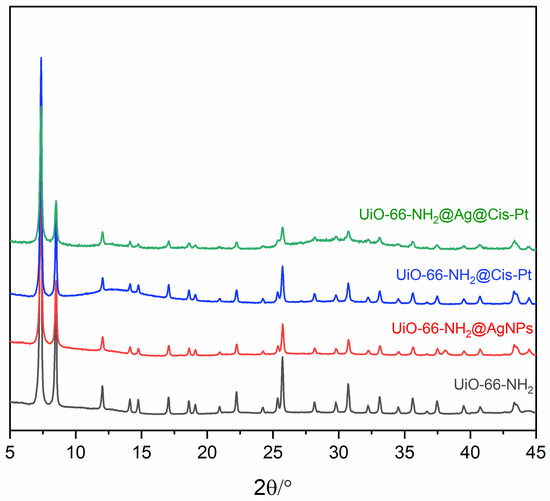 | UiO-66-NH2@AgNPs@Cis-Pt | 504 m2/g | 0.20 wt% | 6.50 wt% |