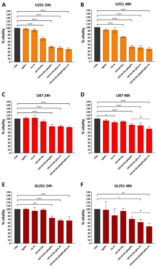 3.2.2. Effect of UiO-66-NH2@AgNPs on Glioblastoma Cell Lines
