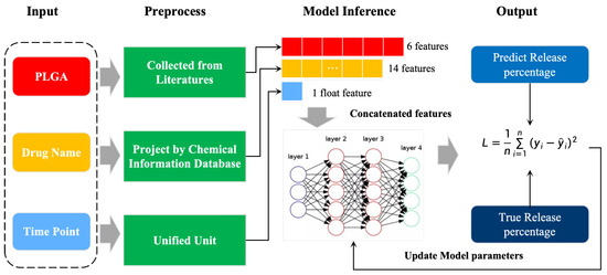 However, these applications have neglected to pay attention to the effects of the carrier and the drug itself and their interactions on the drug release, so we built a model for in vitro drug release curves, DrugNet, to fit these different drug release curves in vitro based on the PLGA carriers (Figure 1). This research aims to explore the potential of a neural network model for fitting the in vitro drug release profiles of PLGA-based systems. Specifically, we collected six PLGA characteristics that affect the drug release in vitro through research in the literature, including molecular weight, PDI, particle size, zeta potential, monomer ratio, and encapsulation efficiency. Moreover, we combined the collected dataset with the drug names to create a dataset dedicated to fitting the curves for in vitro drug release, which can provide data support for subsequent work. In addition, DrugNet extracted key information features on the drugs from a chemical information database and combined the data features for PGLA and predicted time points as the input to the model for curve fitting training. With the neural network model, we avoid formalized prediction results and can fit multiple types of drug release curves.