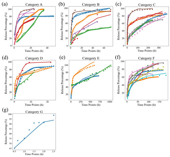 Meanwhile, we also calculated the standard deviations in the MSE and values for the three models on all samples, as shown in Table 4. The standard deviations in the MSE and were 12.662 and 0.031, respectively, which were 3.22 and 0.015 lower than these values for the best semi-empirical model, the Weibull model. This indicates that our model’s results have less variability than that in the Korsmeyer–Peppas and Weibull models, demonstrating the stability of neural networks in fitting drug release curves for different samples. Due to the significant differences in the time scales of the samples, in order to demonstrate the fitting effect of the neural network more clearly, we simply divided the samples based on their release time scales and visualized them, as shown in Figure 3. The discrete points are the actual data, while the curves are the predicted values, which can be divided into seven release time scale ranges: A, B, C, D, E, F, and G. Among these, the time scale of G is the smallest, at about 0–2.5 h, and the time scale of E is the largest, at about 0–1000 h. From the graph, it can be seen that although the time span is large, the overall fitting effect of DrugNet is excellent.