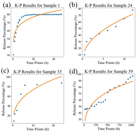The results of the K-P model. (a) The result for sample 1, (b) the result for sample 24, (c) the result for sample 35, and (d) the result for sample 39. The discrete points are the true values, and the curves are the predicted values.