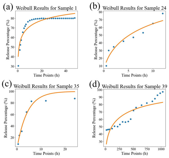 Pourtaebi Jahromi et al. [7] comprehensively compared various kinetic models for the drug release from PLGA-based nanoparticles, demonstrating that the Weibull model fit the release data best due to its flexibility and high accuracy. Therefore, the Weibull and Korsmeyer–Peppas models were used to fit each sample in the dataset, and the corresponding MSE and values were calculated; the results are given in Table 2 and Table 3. The Korsmeyer–Peppas model has an average MSE of 34.327 and an average of 0.934. The average MSE of the Weibull model is 14.894, and the average is 0.965. The MSE of the Weibull model is 19.422 lower than that of the Korsmeyer–Peppas model, and the value is 0.031 higher, which proves that the error between the predicted value and the actual value is smaller, the degree of fitting is higher, and the flexibility is higher.