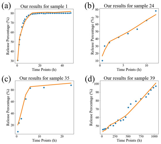 In order to visually compare the superiority of our model, we compared the fitting performance of the traditional models and DrugNet on certain samples, as shown in Figure 4, Figure 5, and Figure 6, which are visualizations of the fitting performance of the K-P and Weibull models and DrugNet on samples 1, 24, 35, and 39, respectively. Samples 1, 24, 35, and 39 are those whose release curves clearly do not conform to the exponential function. The discrete points are the actual data, and the curves are the predicted values. It can be seen that due to the form and parameter limitations of the explicit mathematical formulas in traditional semi-empirical models, the shape of the fitted curve is similar. However, it is difficult to obtain good fitting results for samples with significant changes in the curve’s shape. The neural network DrugNet uses the relevant features of the PLGA carriers, drug molecules, and time points as inputs; focuses on the factors that affect the drug release curve; and implicitly learns their interaction relationships by training the network parameters. Therefore, the neural network can capture the nonlinear relationships in drug release data better. Therefore, neural networks perform better in handling nonlinear changes in the data, demonstrating greater adaptability and advantages than traditional models.
