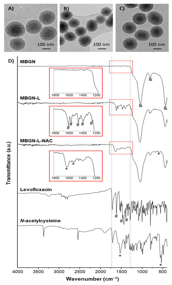 Physicochemical characterization of the different materials synthesized. TEM images of (A) MBGN, (B) MBGN-L, and (C) MBGN-L-NAC samples. (D) FTIR spectra of the obtained materials. “&” symbol indicates the bands assigned to silica mesoporous framework; “#” symbol indicates the levofloxacin bands, and “*” symbol corresponds to the N-acetylcysteine anchoring via amide bond.