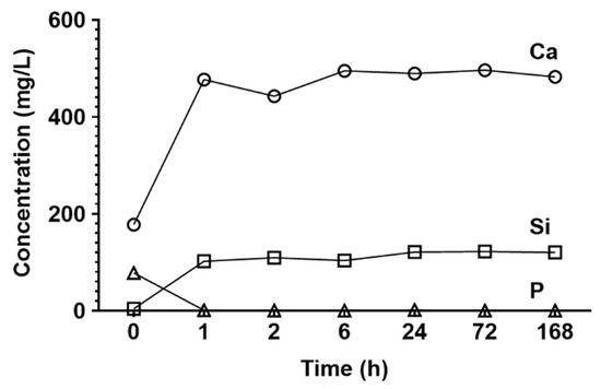 Atom concentrations of Ca, Si, and P in SBF from a suspension of MBGN during 168 h.
