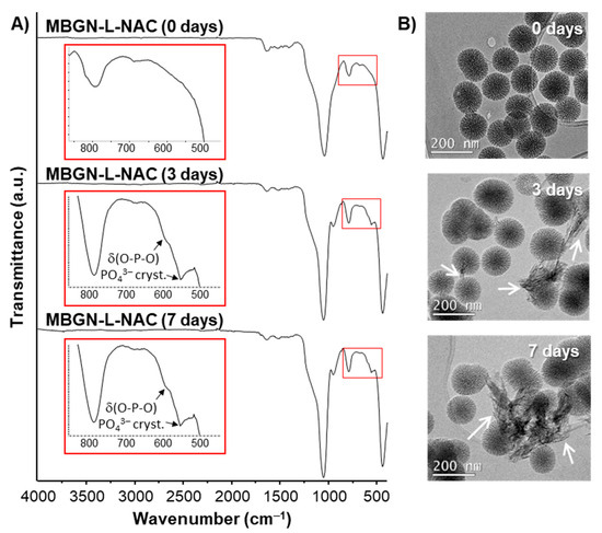 In vitro bioactivity testing of MBGN-L-NAC after being soaked in SBF for 0, 3, and 7 days. (A) FTIR spectra and (B) TEM images corresponding to MBGN-L-NAC after soaking in SBF for different times. The white arrows show the needle-like calcium phosphate crystals formed.